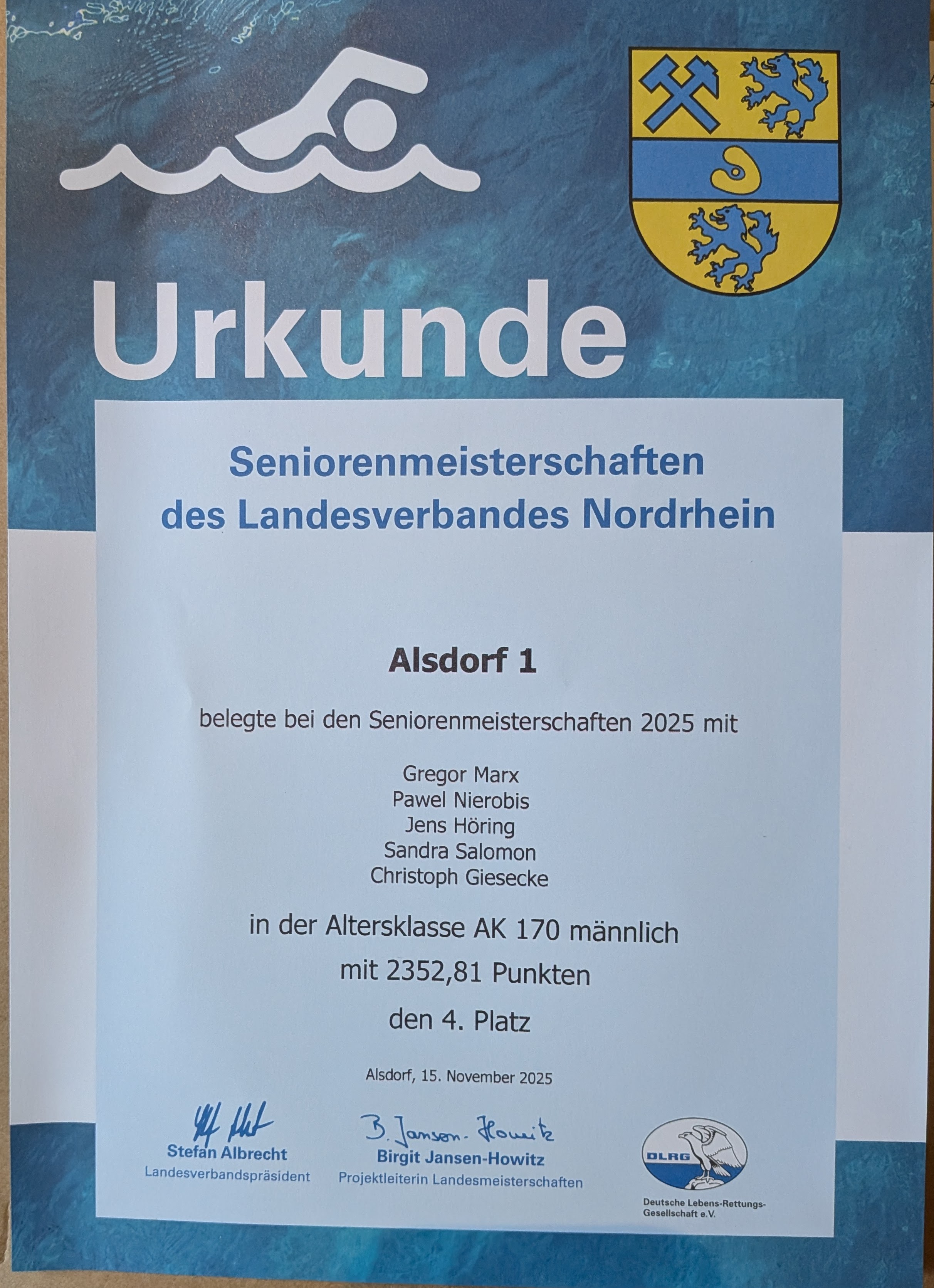 Nach den Bezirksmeisterschaften im Frühjahr haben wir auch gemeinsam mit der DLRG Ortsgruppe Alsdorf-Hoengen e.V. am Samstag (15.11.2025) die Landesseniorenmeisterschaften 2025 im Alsdorfer Annabad ausgerichtet.
