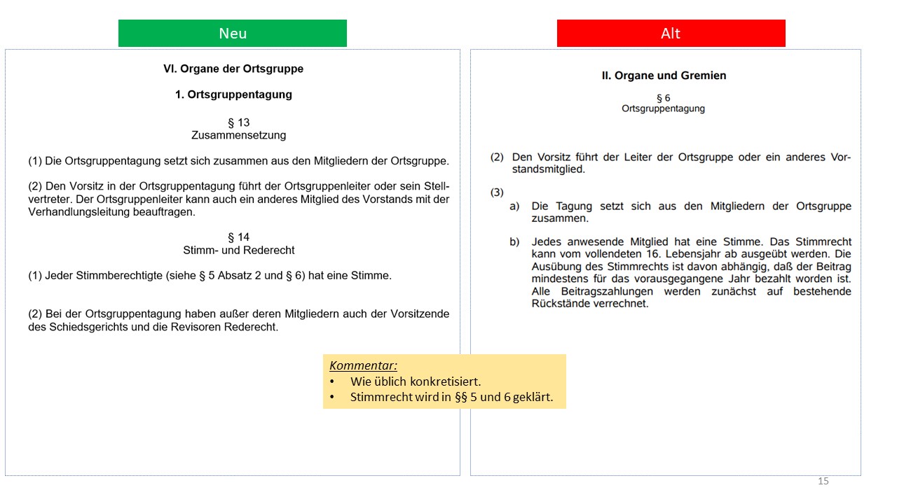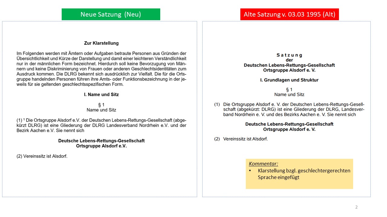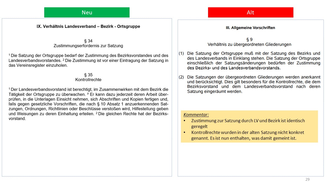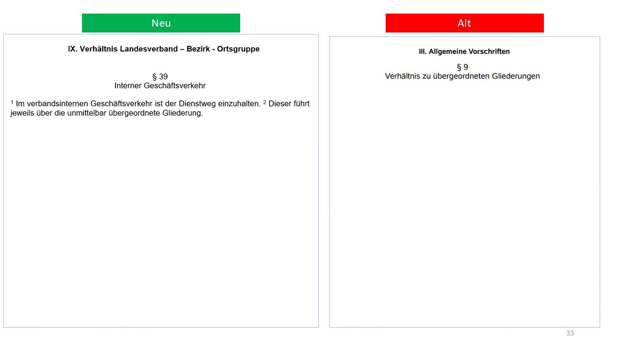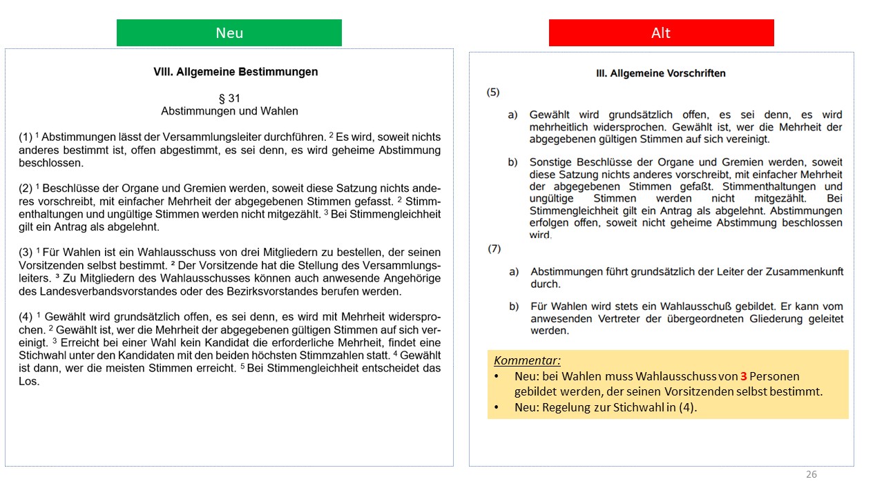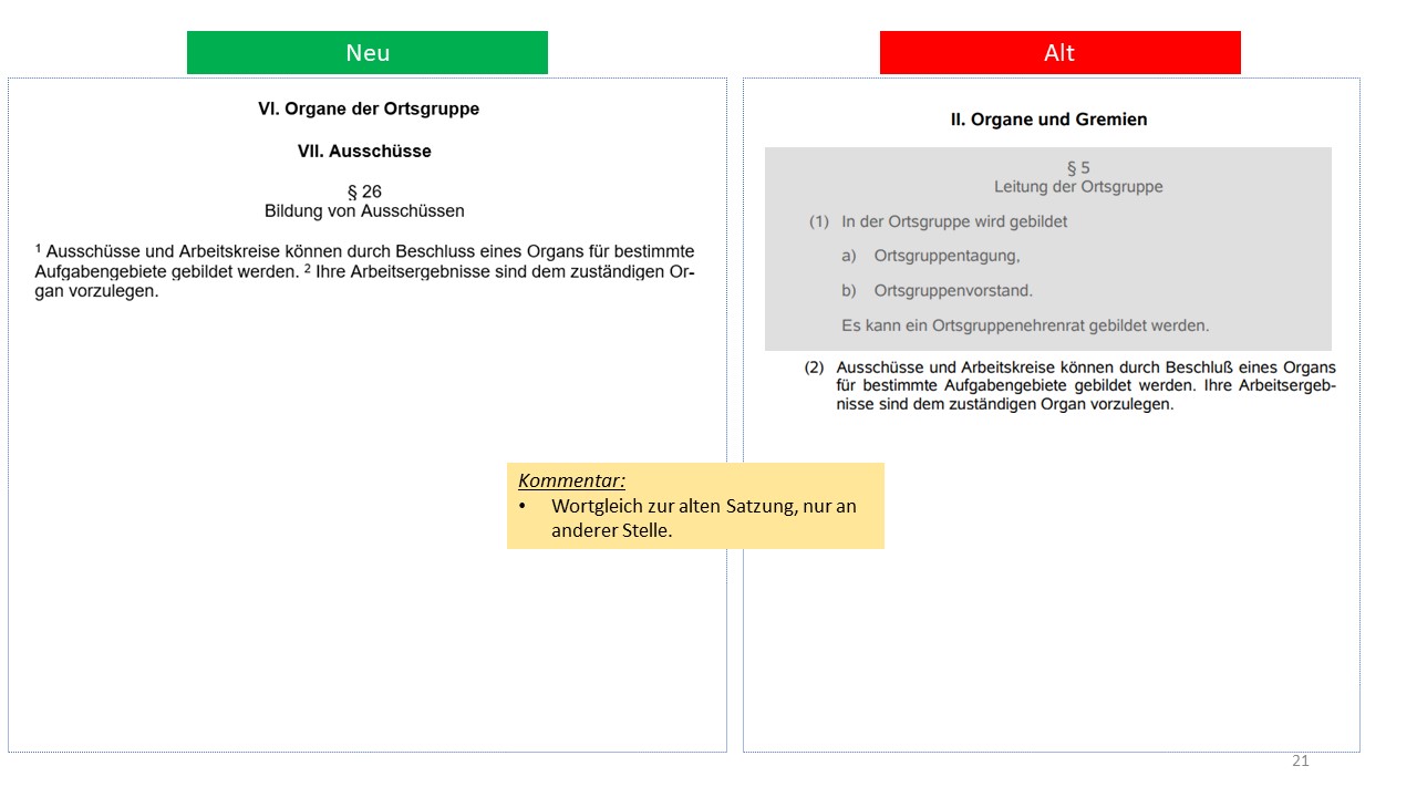 Hier der detailierte Vergleich der alten Satzung von 1995 mit dem Entwurf der neuen Satzung (weitestgehende Übernahme der aktuellen Mustersatzung des LV in der Version vom 20.06.2021)