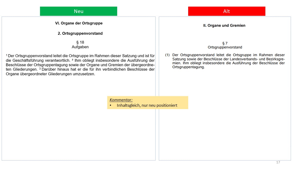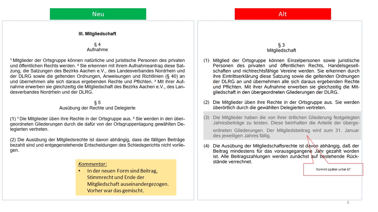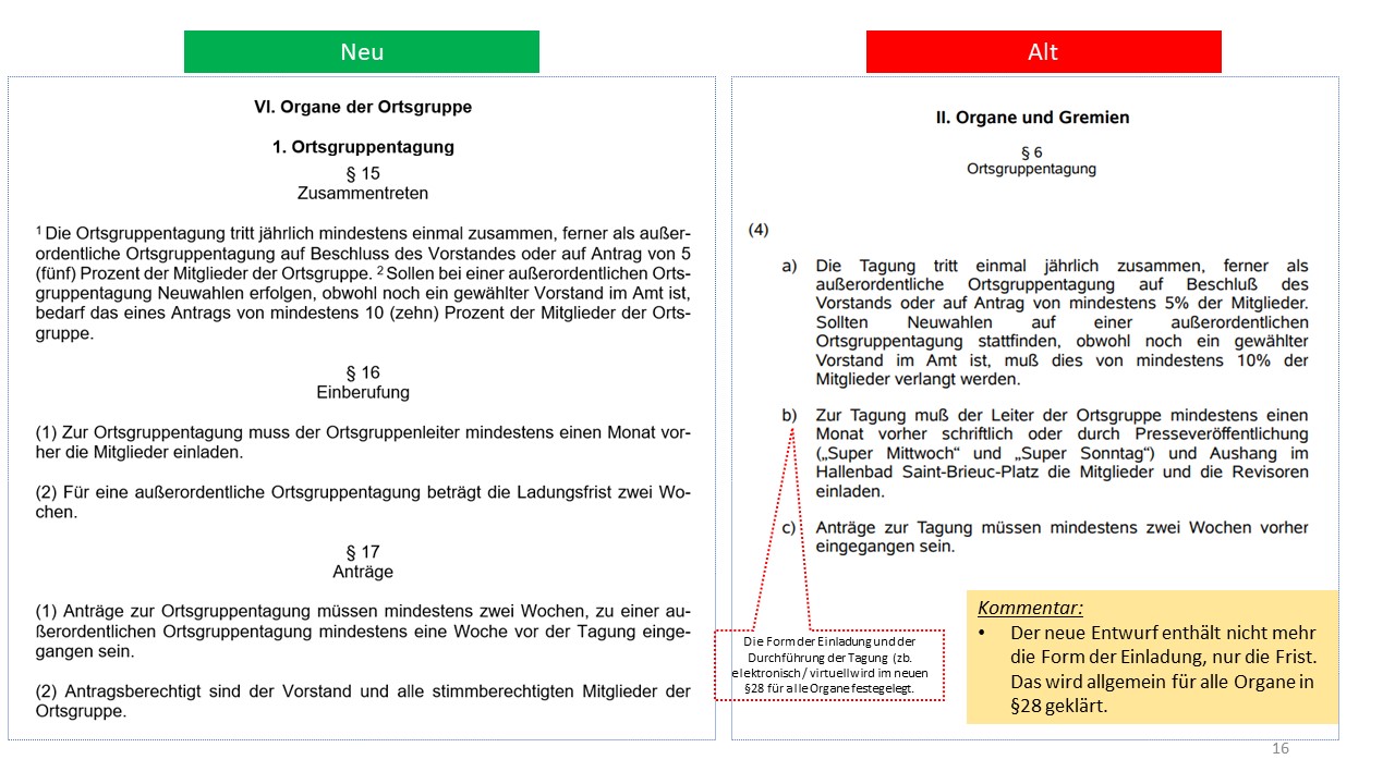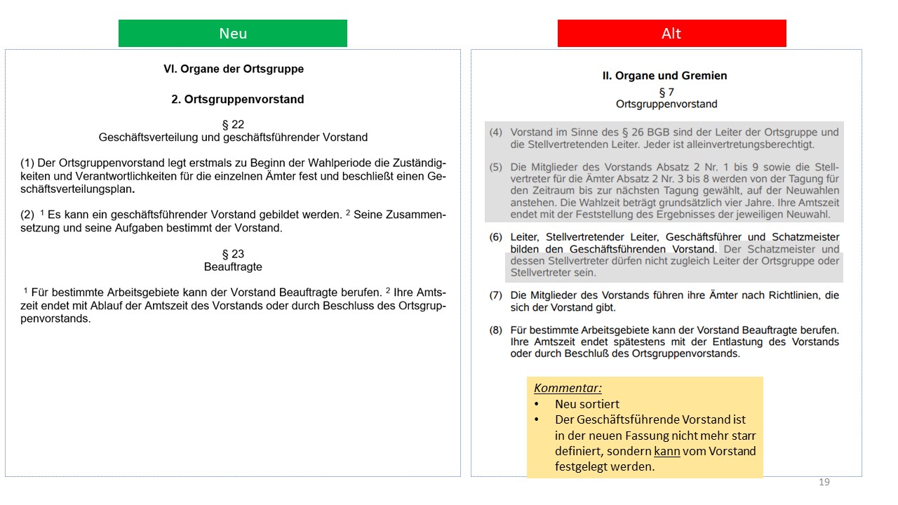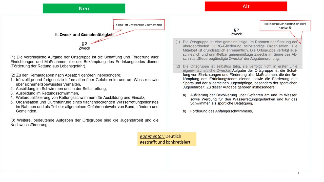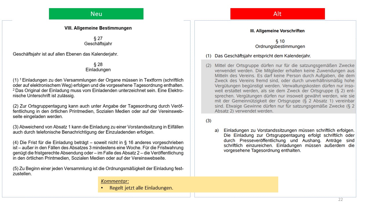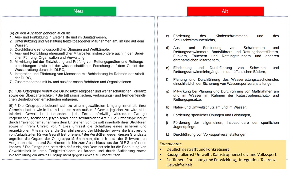 Hier der detailierte Vergleich der alten Satzung von 1995 mit dem Entwurf der neuen Satzung (weitestgehende Übernahme der aktuellen Mustersatzung des LV in der Version vom 20.06.2021)