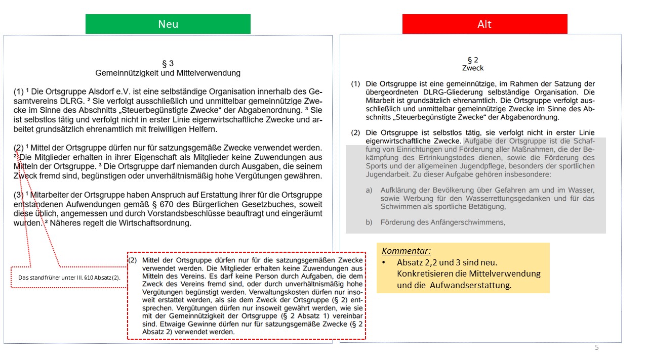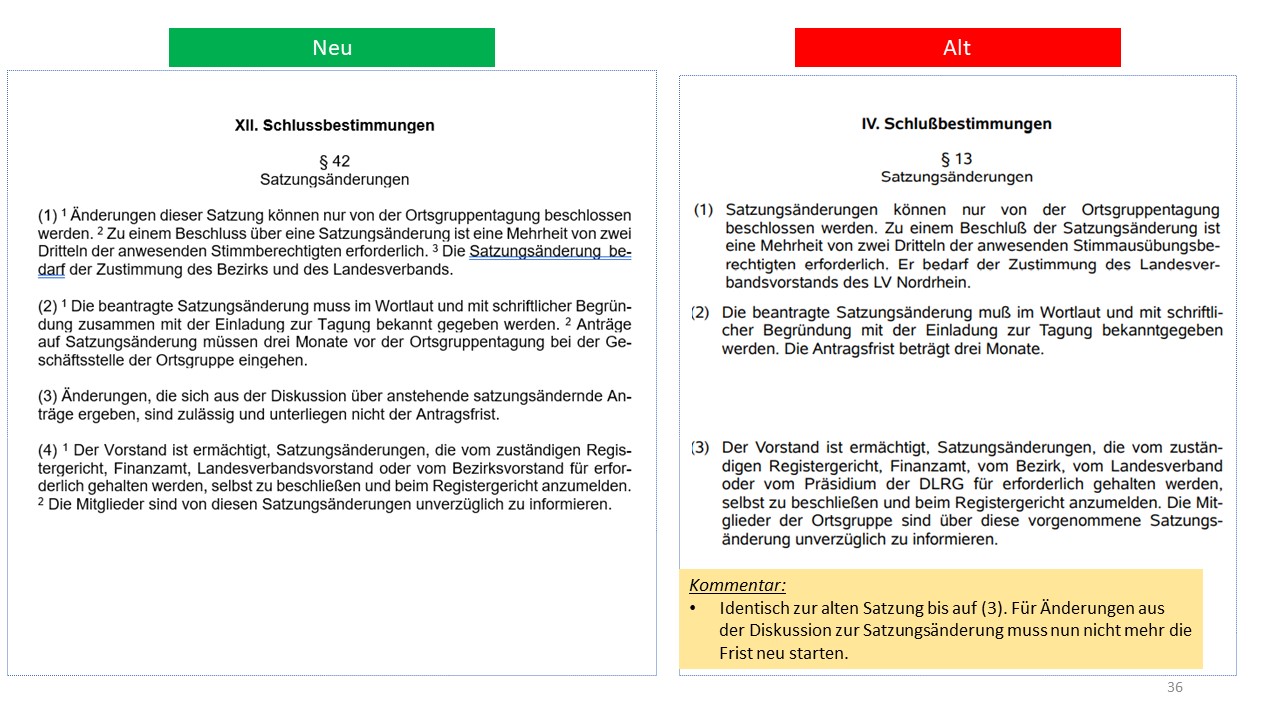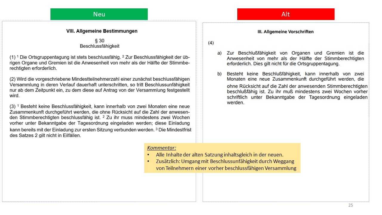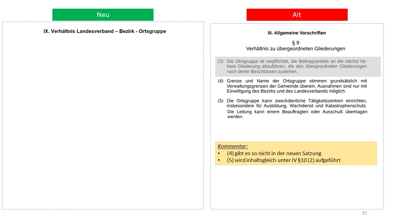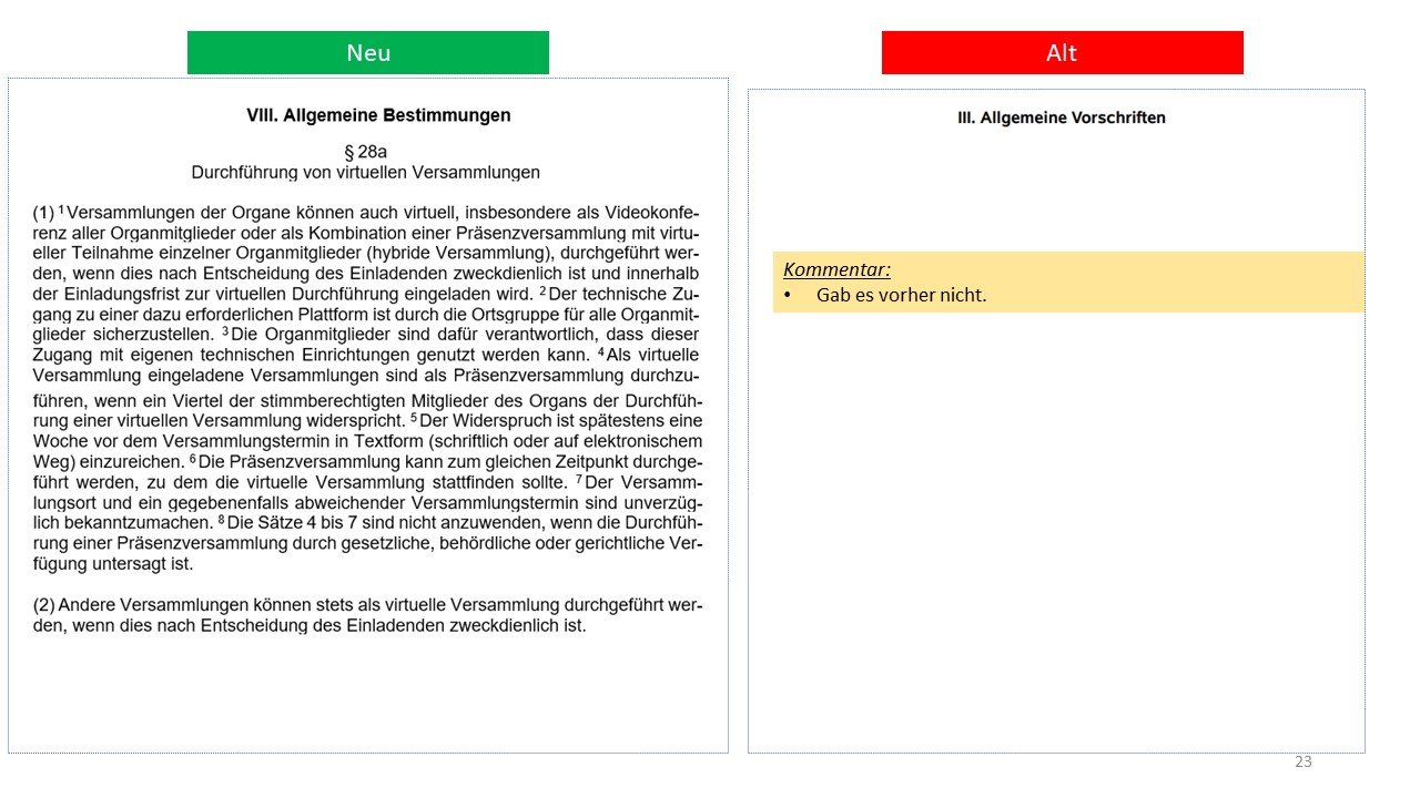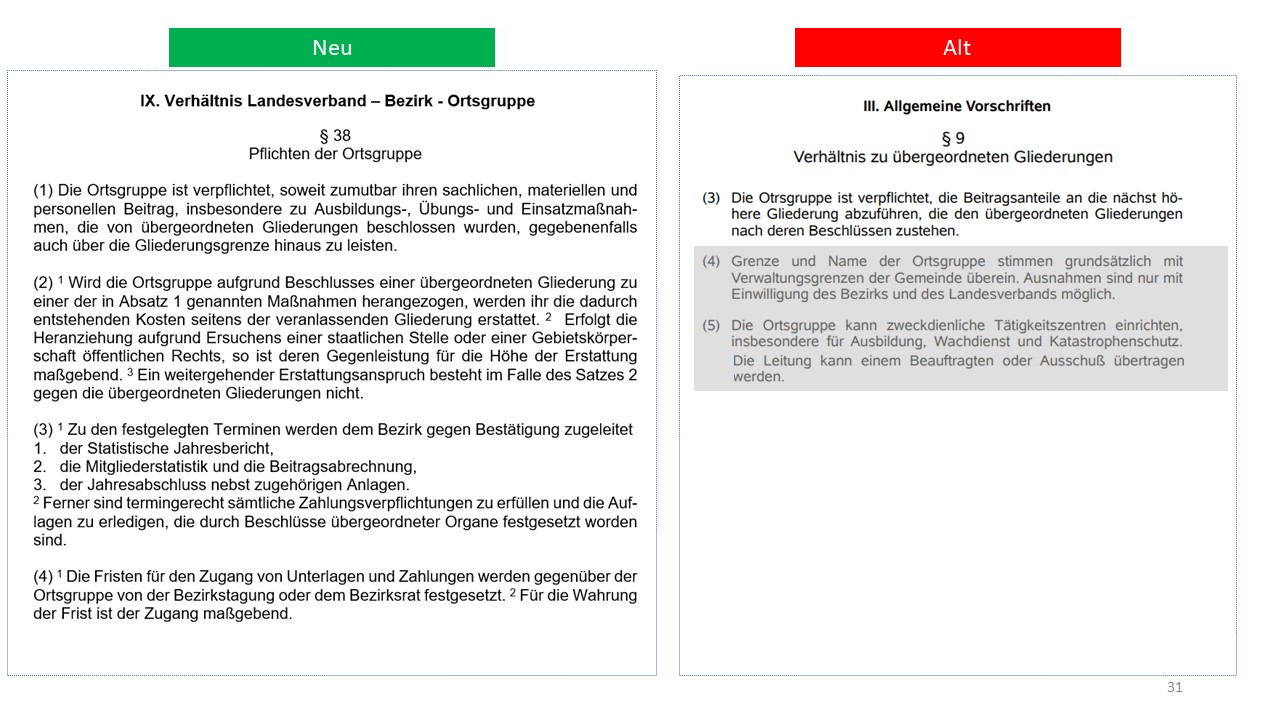Hier der detailierte Vergleich der alten Satzung von 1995 mit dem Entwurf der neuen Satzung (weitestgehende Übernahme der aktuellen Mustersatzung des LV in der Version vom 20.06.2021)